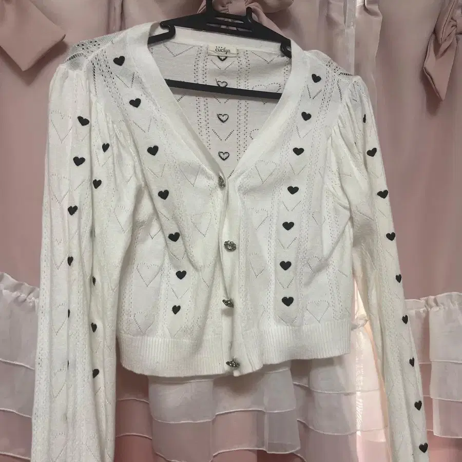 하트 무늬 화이트 가디건 evelyn 에블린 비쥬 버튼