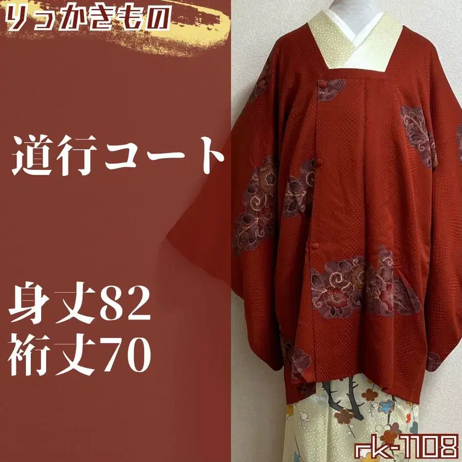 깊은 오렌지 컬러에 금채와 동백 문양이 고급스러운 도우치 코트입니다. 만족스러운 긴 길이 사이즈.