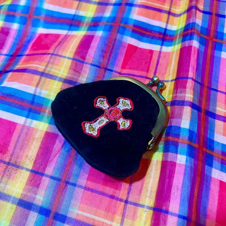 블랙 벨로아 느낌의 원단에 핑크 컬러 십자가가 귀엽습니다. 장미 꽃, 달, 별, 하트 등이 금실을 섞어 표현되어 가련합니다*