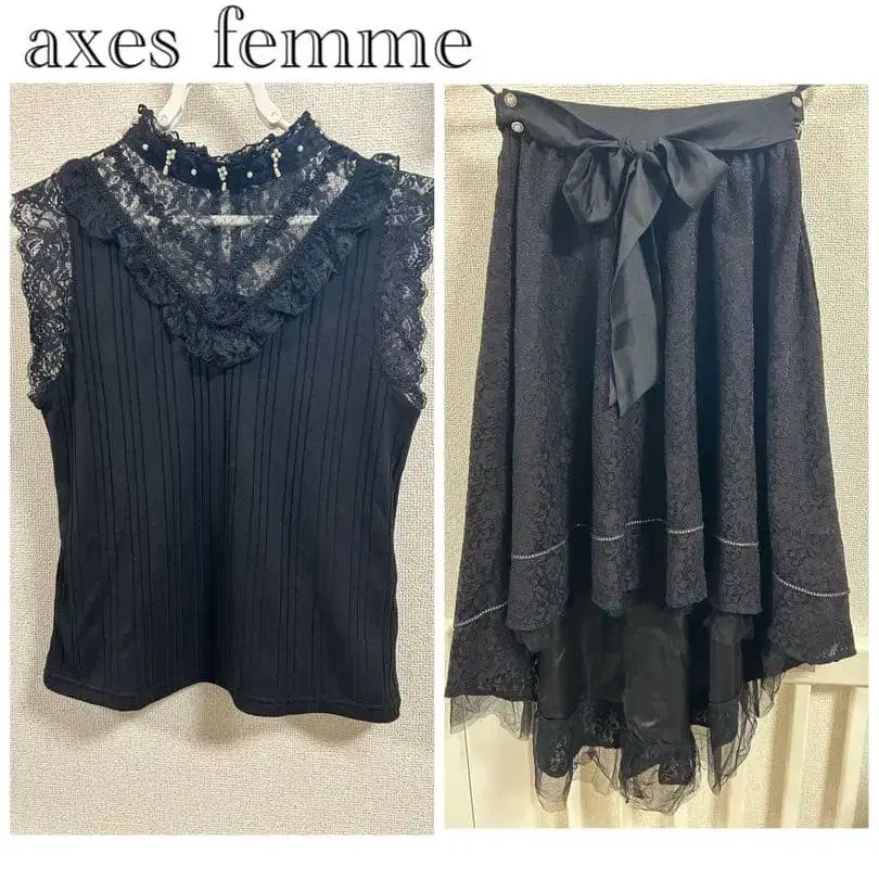 자동 번역되었어요. 원문보기레이스 포함 블랙 슬리브리스 셔츠와 리본 포함 하이웨이스트 스커트 세트.