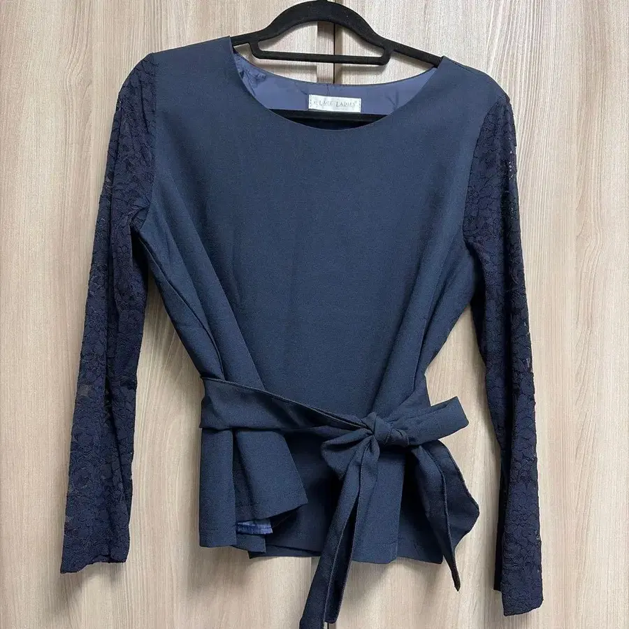 자동 번역되었어요. 원문보기네이비 색상의 레이스 슬리브와 허리 리본이 특징인 긴팔 상의.
