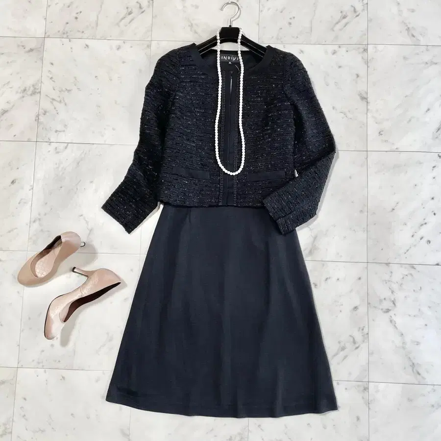 인디비의 노카라 트위드 자켓과 언타이틀의 스커트 셋업, 수트입니다.