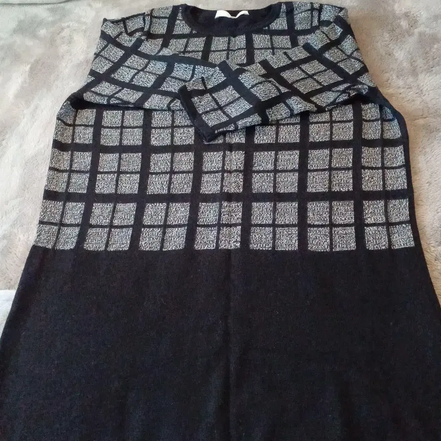 자유구 7부 소매 니트 원피스 튜닉 블랙과 그레이 체크 무늬