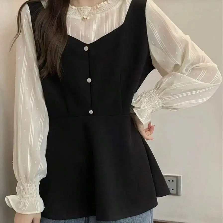 인기!! 프렌치 스타일 프릴 셔츠 블랙 오피스 파티 고급 가을/겨울