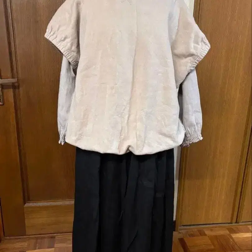 소재를 살려 오버 사이즈로 만들었으며, 허리 둘레를 덮는 긴 기장과 신체의 라인을 드러내지 않는 루즈한 실루엣으로 완성했습니다.
