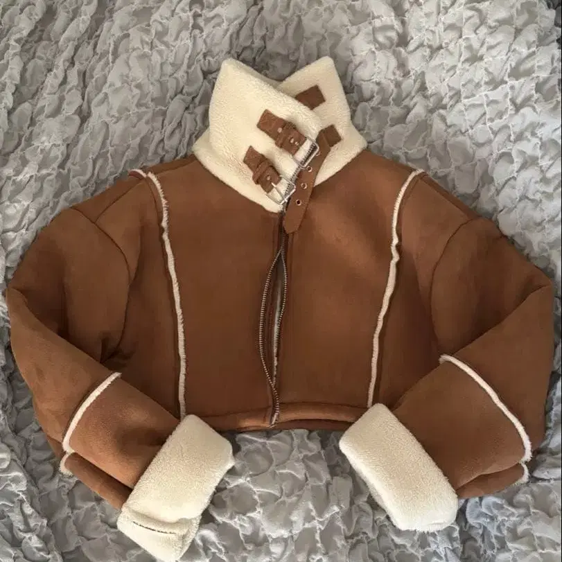 브라운 무스탕 코트 숏 기장 크롭 보아