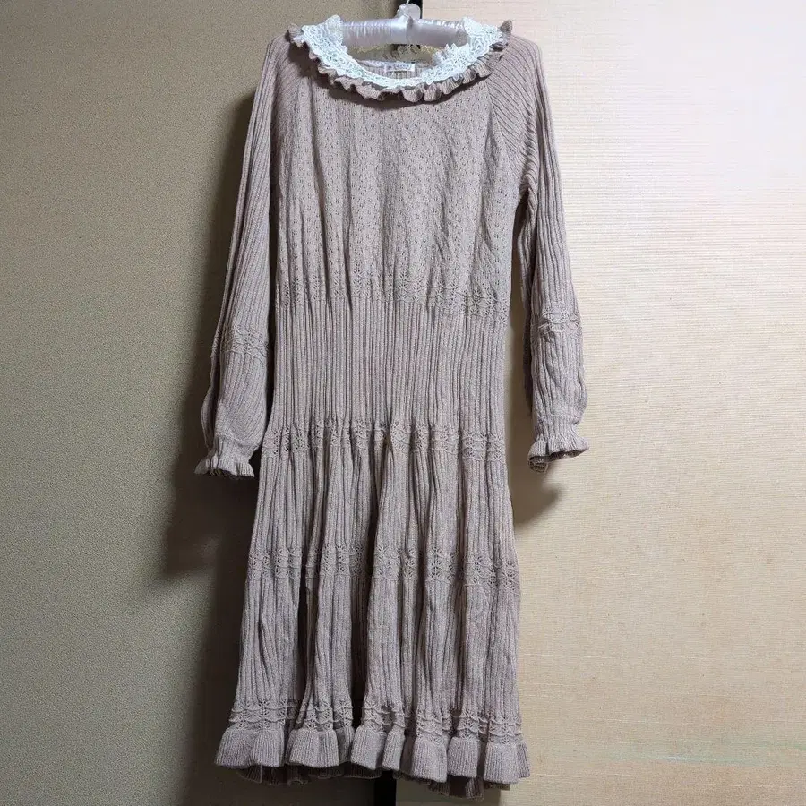 엑시즈팜 베이지 레이스 부착 긴팔 니트 원피스
