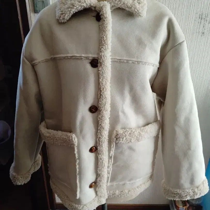 보아 카라 부착 크림색 플리스 자켓