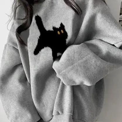 그레이 오버 사이즈 맨투맨 검은 고양이 프린트