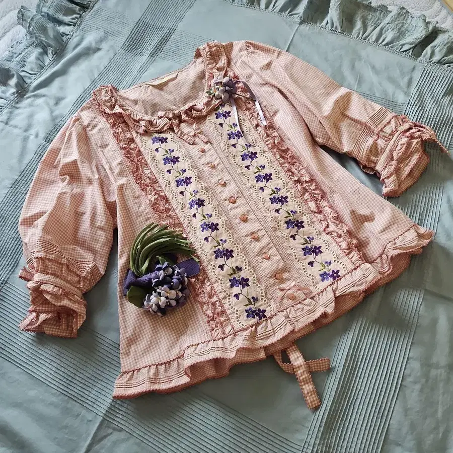 핑크하우스 [택 포함 미사용 새상품] 제비꽃 자수 깅엄 블라우스 핑크