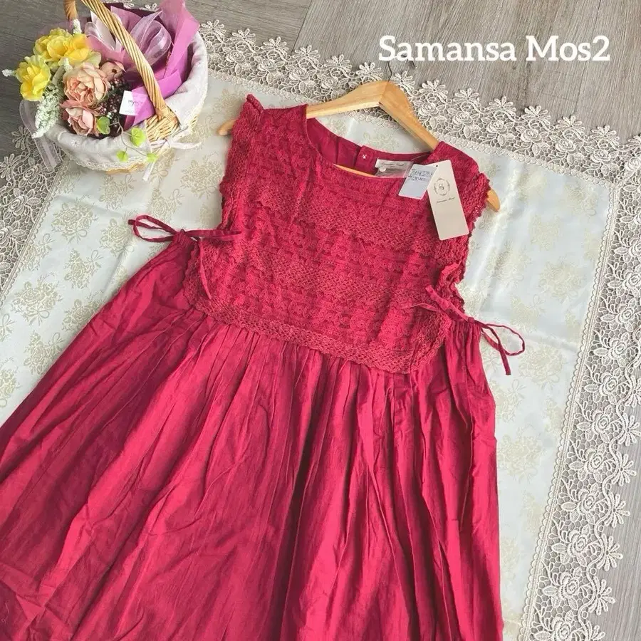 새상품 사만사 모스모스 린넨 레이스 리본 슬리브리스 원피스 레드
