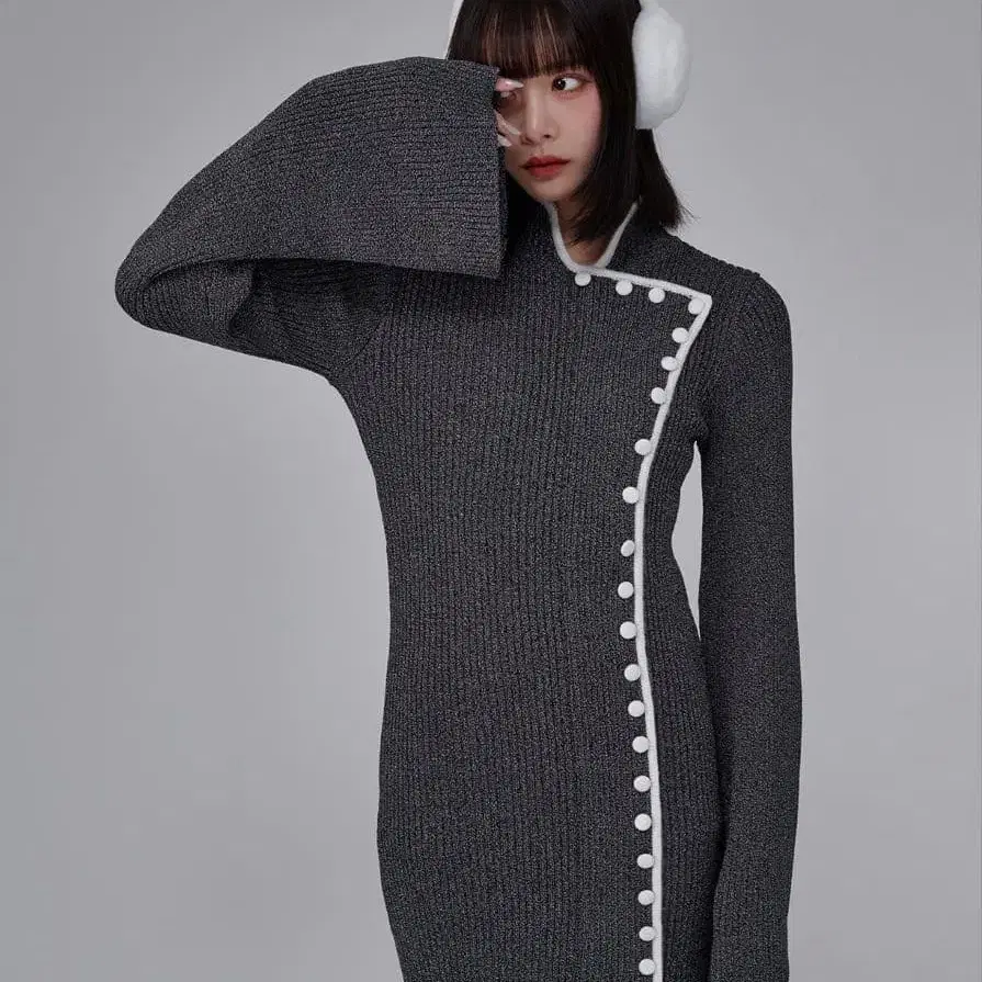 목 부분과 라인이 차이나 드레스풍 디자인으로 된 무릎 위 기장의 원피스입니다. 라메가 들어간 무게감 있는 니트 소재로 몸의 라인을 예쁘게 살려줍니다. 소매는 길고 밑단이 넓게 퍼지는 디자인으로 팔이 가늘고 길어 보이며, 전체적으로 타이트한 실루엣으로 허리도 잘록하게 들어가 스타일up 할 수 있는 아이템입니다. 무지의 심플한 원피스에 라인을 넣고 안쪽에 연속적인 싸개 버튼을 배치하여 포인트를 주었습니다. 원단과 대비되는 색상의 라인으로 더욱 입체적이고 개성 있는 원피스로 만들었습니다.