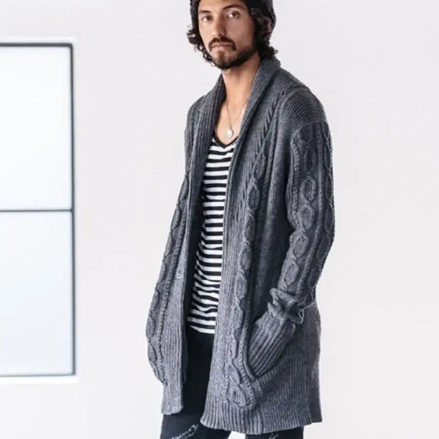 울을 포함한 두께감 있는 케이블 니트로 완성한 가운 코트 (숄카라 롱 가디건)입니다.