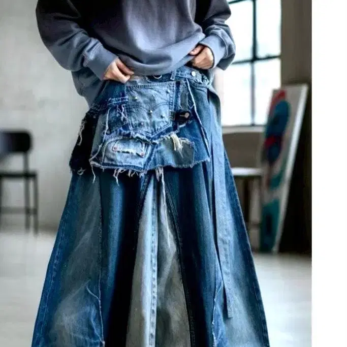 데님 리메이크 빅 플레어 팬츠 x 플리츠 랩 스커트 셋업