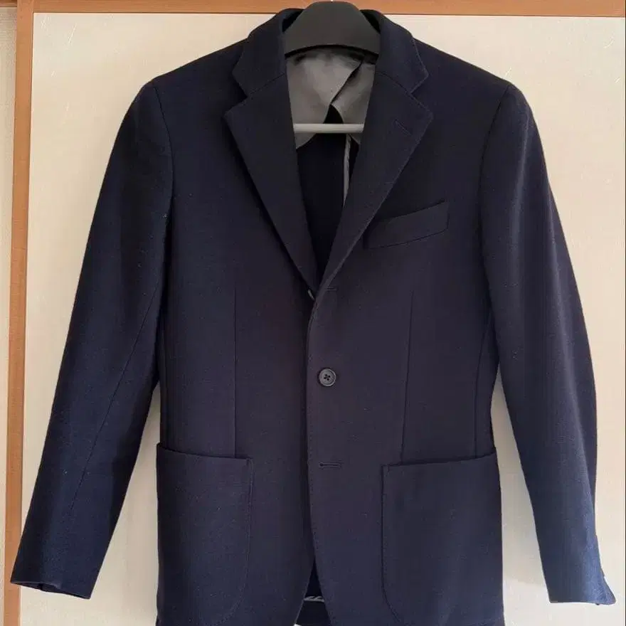 심플한 네이비 테일러드 자켓이며, 안쪽 포켓이 있어 실용성도 갖추고 있습니다.