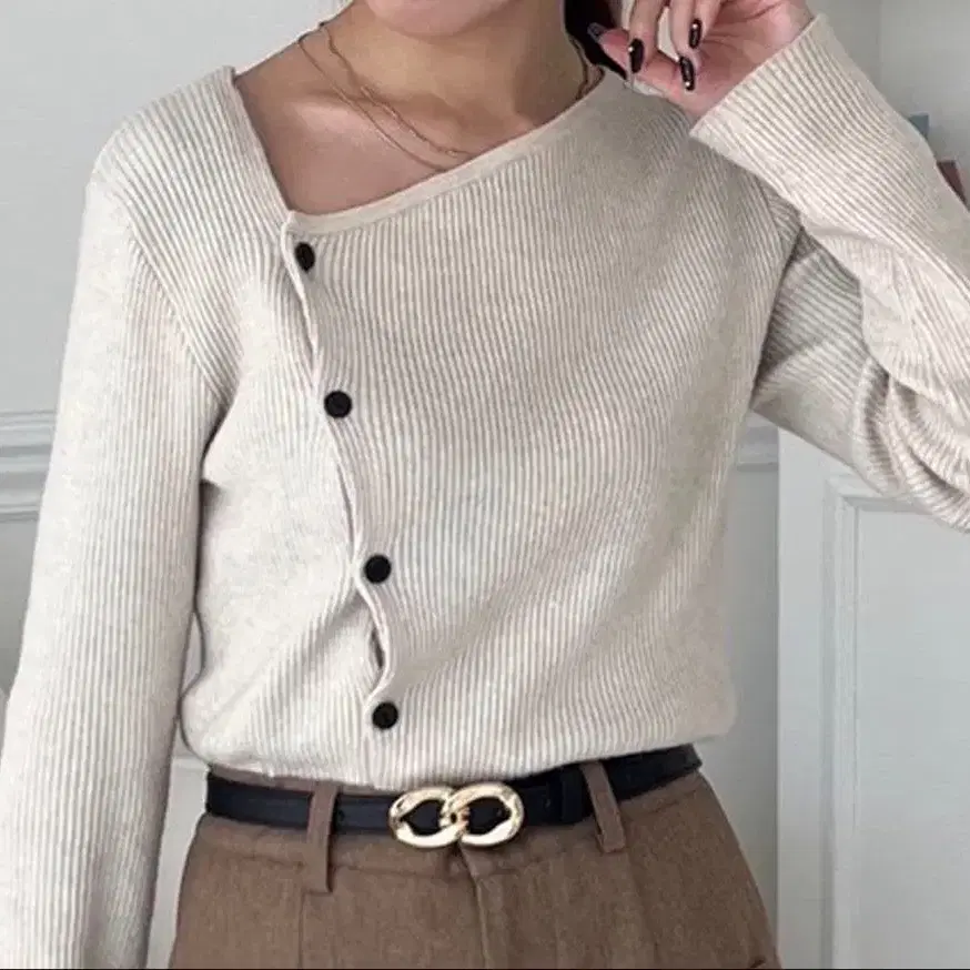새상품 제본 아지메 넥 버튼 리브 니트 아이보리