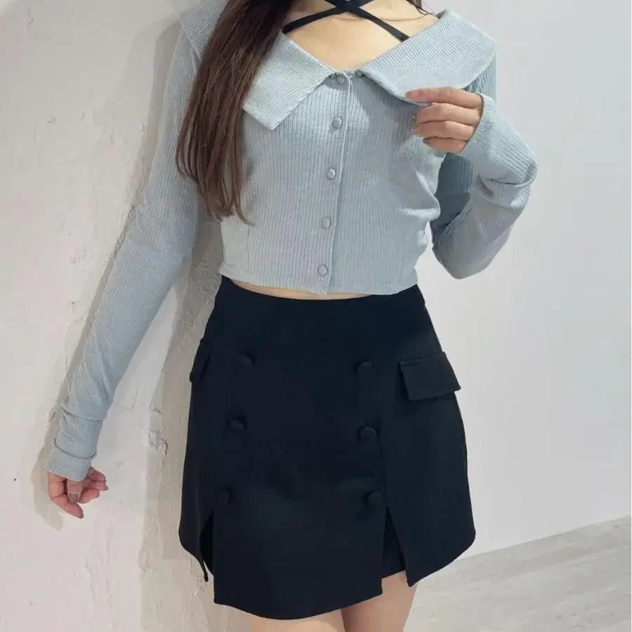 EATME 크로스넥 리브 TOP 블루 긴팔 니트탑