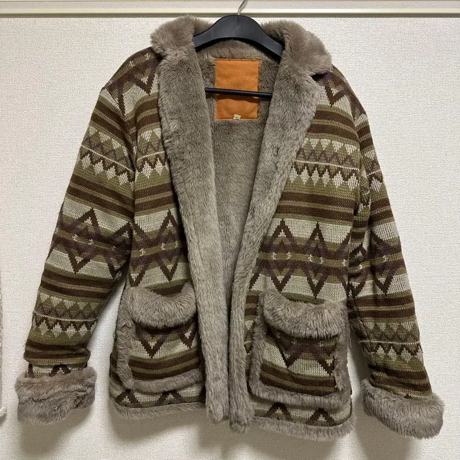 겉감은 세련된 네이티브 무늬의 니트 소재, 안감은 털이 긴 보아 원단으로 되어 있습니다.