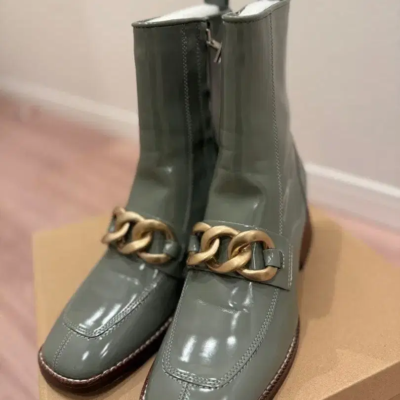 자동 번역되었어요. 원문보기골드 체인 장식의 그레이 부츠, 지퍼로 신고 벗기 쉬운 디자인.