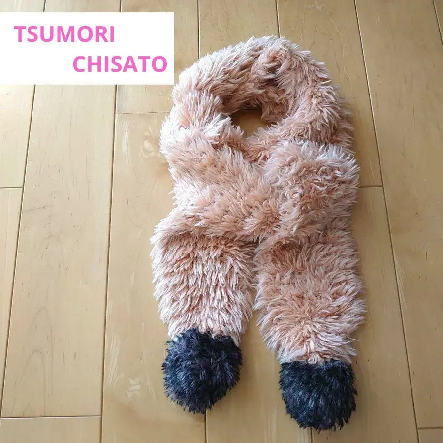츠모리치사토의 라이트 핑크색의 복슬복슬한 롱 머플러입니다. 양 끝에 블랙 폼폼이 달려 있어 아주 귀엽습니다.