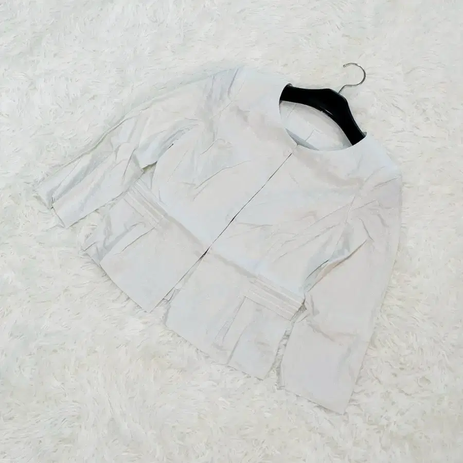 고급스러운 광택감과 고급스러움이 느껴지는 노카라 자켓입니다. 턱 디자인이 허리 라인을 아름답게 보여주는 실루엣입니다. 앞 후크 사양으로 단정함도 ◎