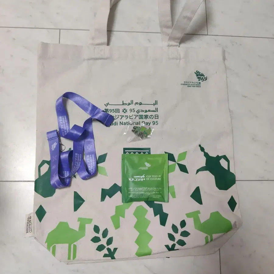 사우디아라비아 건국 95주년 기념 디자인이 적용된 대용량 토트백. - 디자인: 사우디아라비아 건국 95주년 기념 디자인 - 컬러: 크림색과 그린 컬러의 조합 - 소재: 캔버스 소재 - 부속품: 리본 스트랩과 잡화 주머니 - 사이즈: 대용량 토트백 방문해 주셔서 감사합니다.