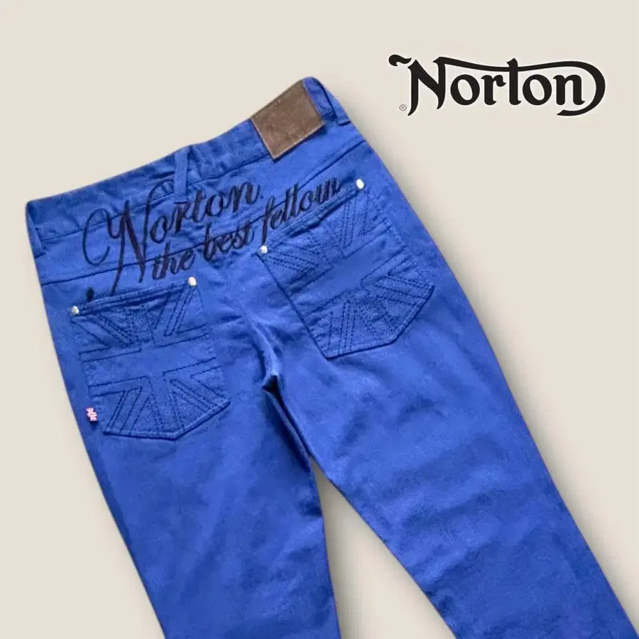 프론트 왼쪽 포켓에는 브랜드 로고가 있으며, 백에는 Norton the best fellow라고 필기체로 자수가 놓여 있습니다. 백 포켓에는 유니언 잭 장식 스티치가 있으며, 이것 또한 노튼다운 디자인입니다.