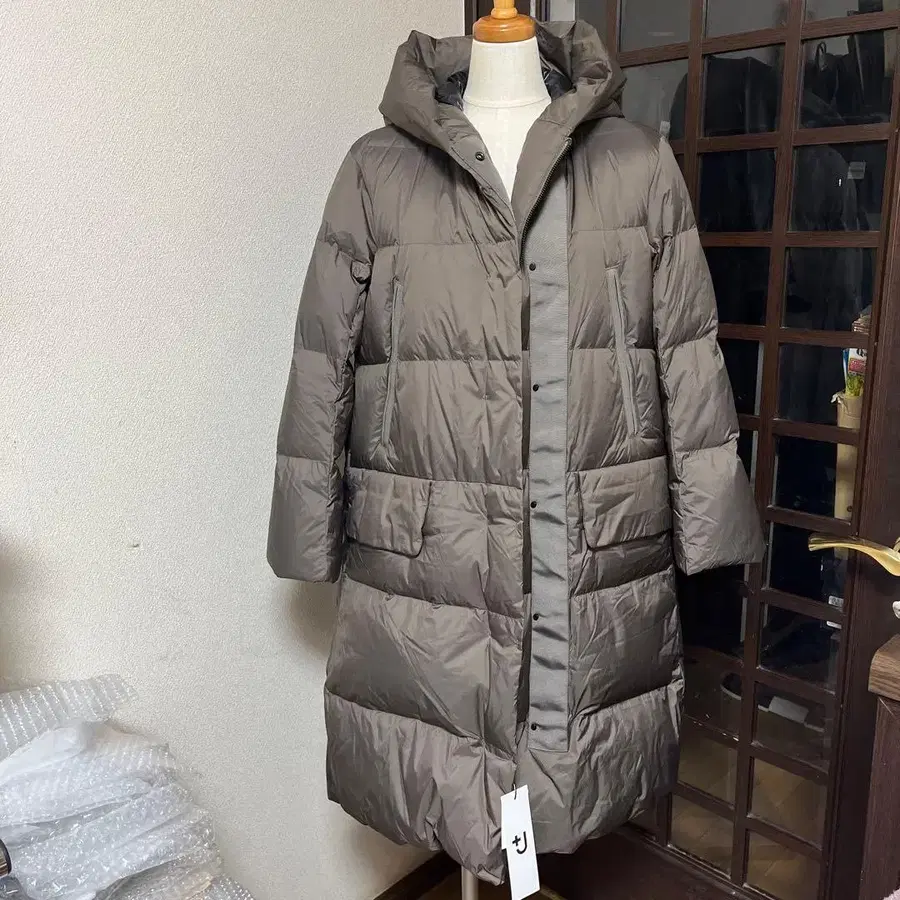 디자이너 질 샌더와 UNIQLO의 콜라보레이션 +J의 넉넉하고 매우 가볍고 따뜻한 다운 롱 코트입니다.