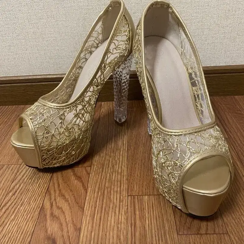 골드 레이스 디자인과 클리어 힐이 특징인 하이힐 펌프스.
