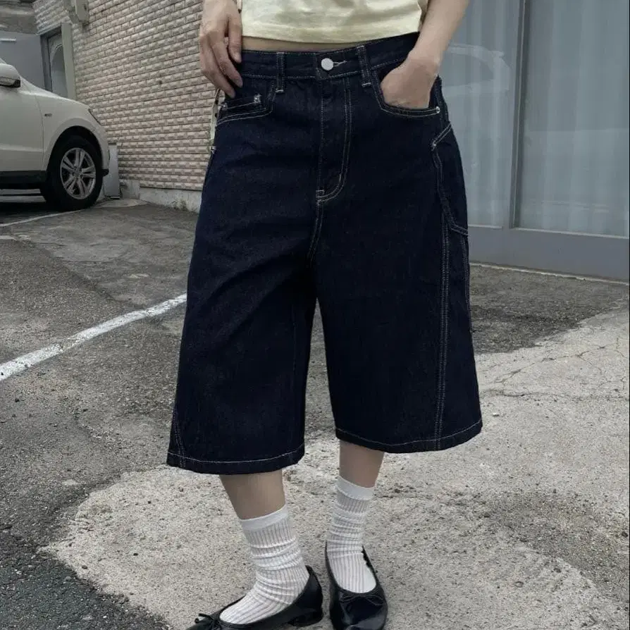 UNE MANSION 유니크 사이드 포켓 하프 팬츠 다크 블루