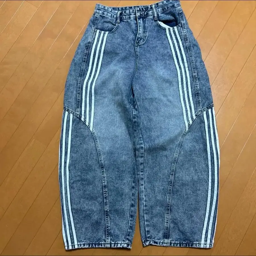 스트라이프 디자인 와이드 레그 데님 팬츠