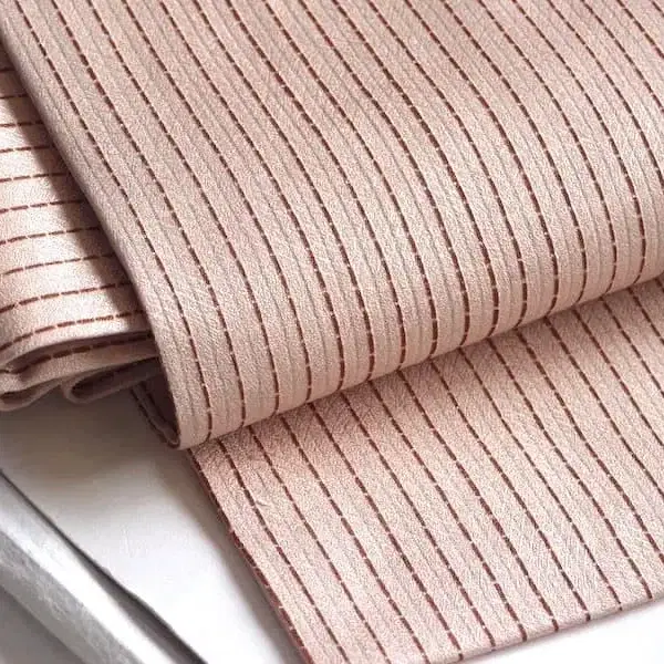 연한 오렌지 베이지 색상에 가는 줄무늬 문양이 염색된 나고야 오비입니다.