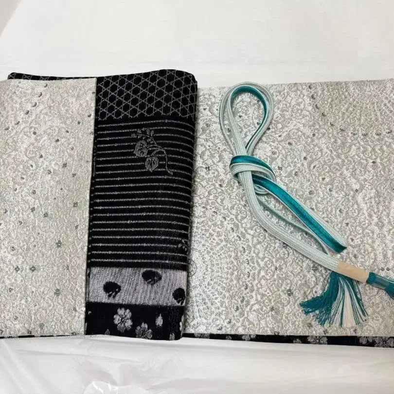 후쿠로 오비 은색과 그린과 블랙의 리버서블 허리띠 세트