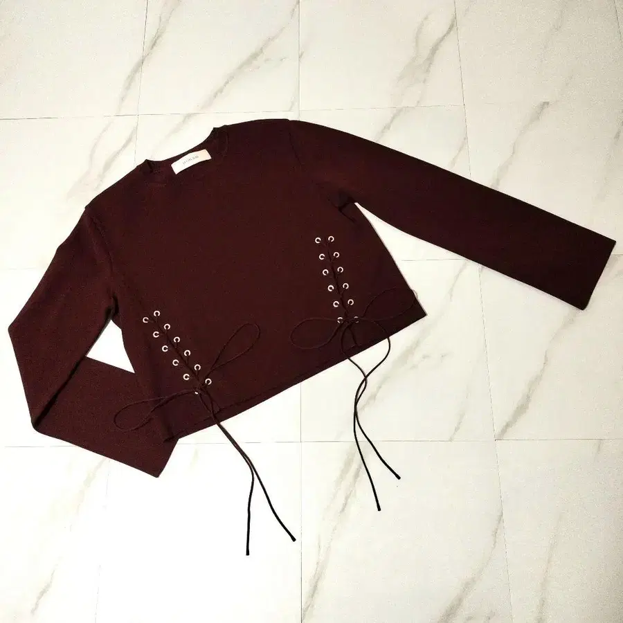 사이드에 레이스업 디자인의 버건디 니트 긴팔 상의.