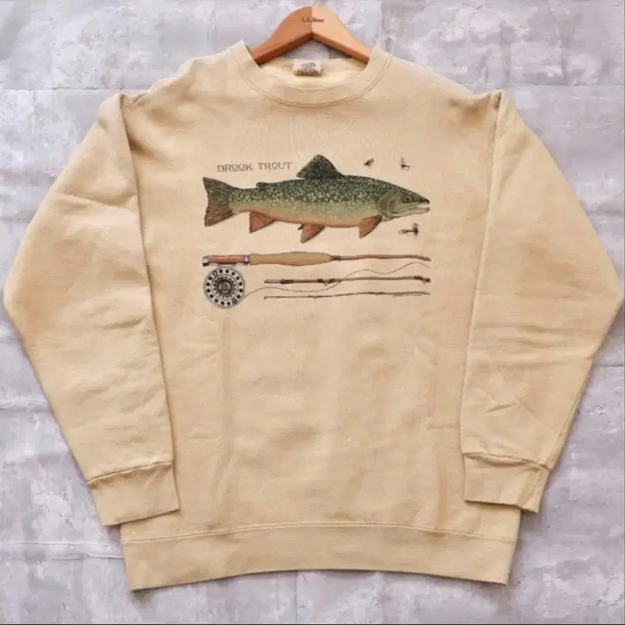 미국제 빈티지 맨투맨. 프론트에는 브룩 송어와 플라이 낚시 장비가 그려진 정교한 프린트가 되어 있어, 아웃도어 및 낚시 애호가에게는 놓칠 수 없는 아이템입니다.