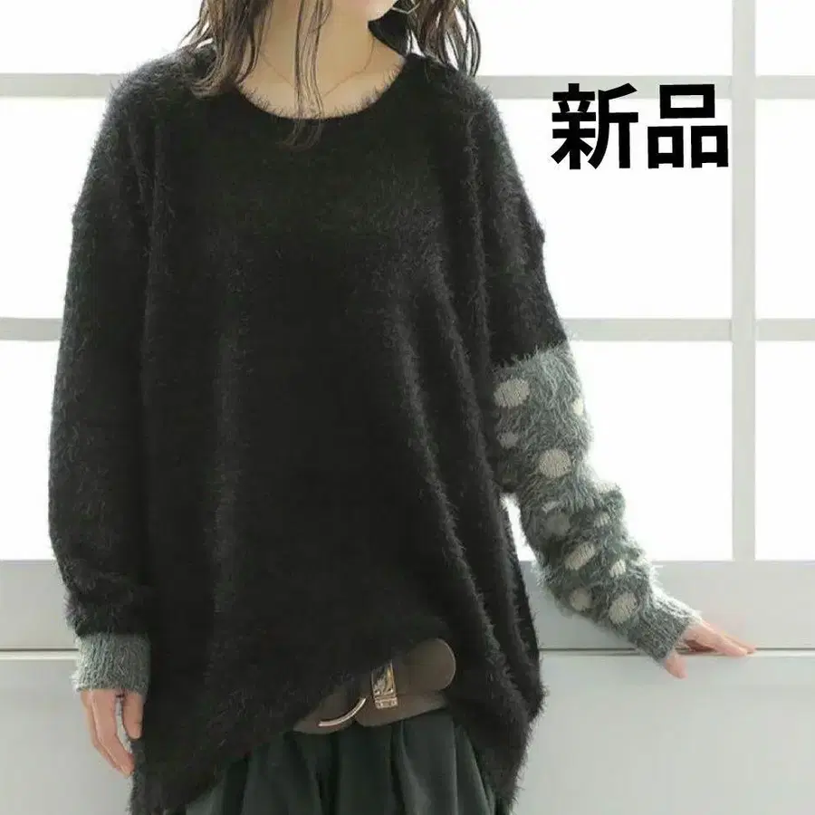 [ 사랑받는 스타일을 만드는, 주역급 존재감. ] 왼쪽 소매 끝의 비대칭 도트 무늬가 시선을 사로잡는 포인트가 되는, 솜털처럼 몽환적인 샤기 니트.