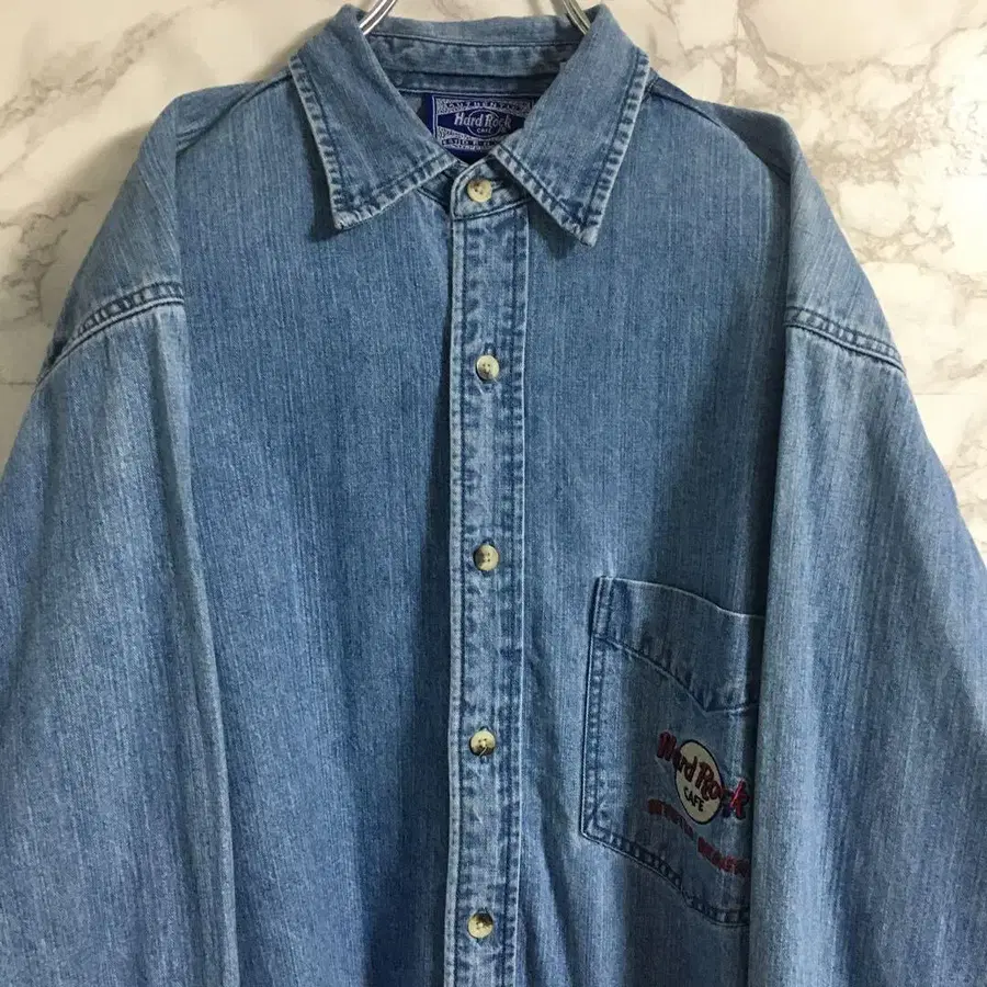 하드 록 카페 양면 로고 자수 원포인트 자수 데님 셔츠 스카이블루 S