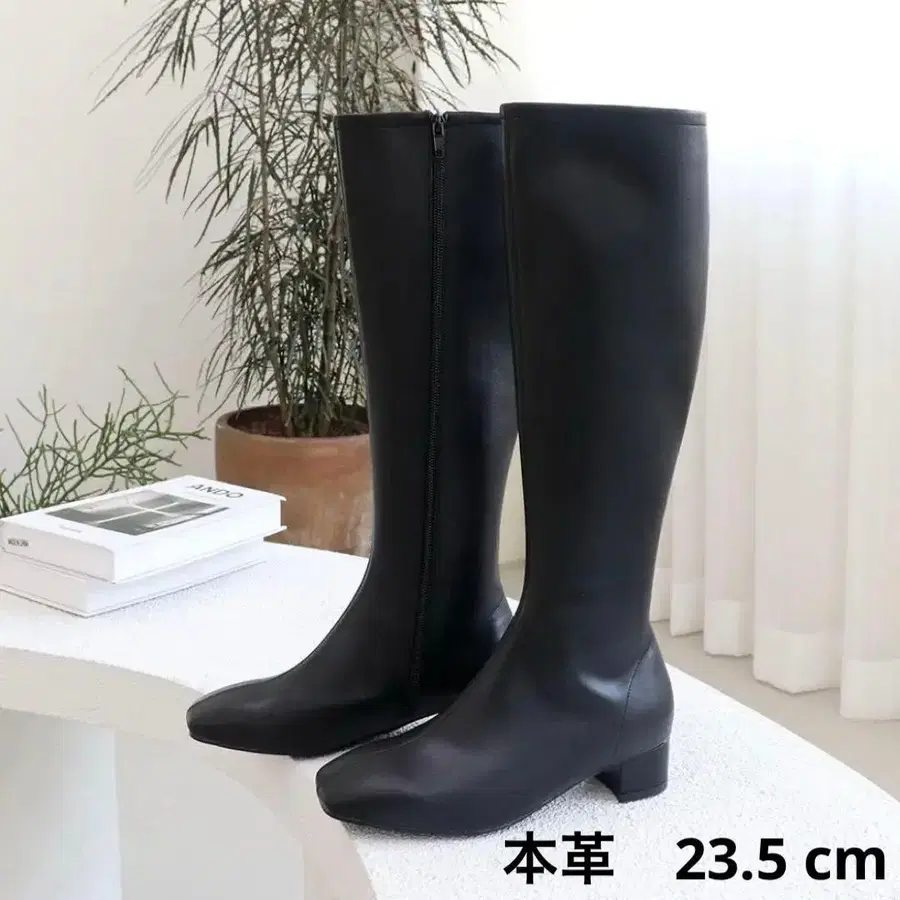 블랙 스퀘어토 롱 부츠 천연 가죽 23.5