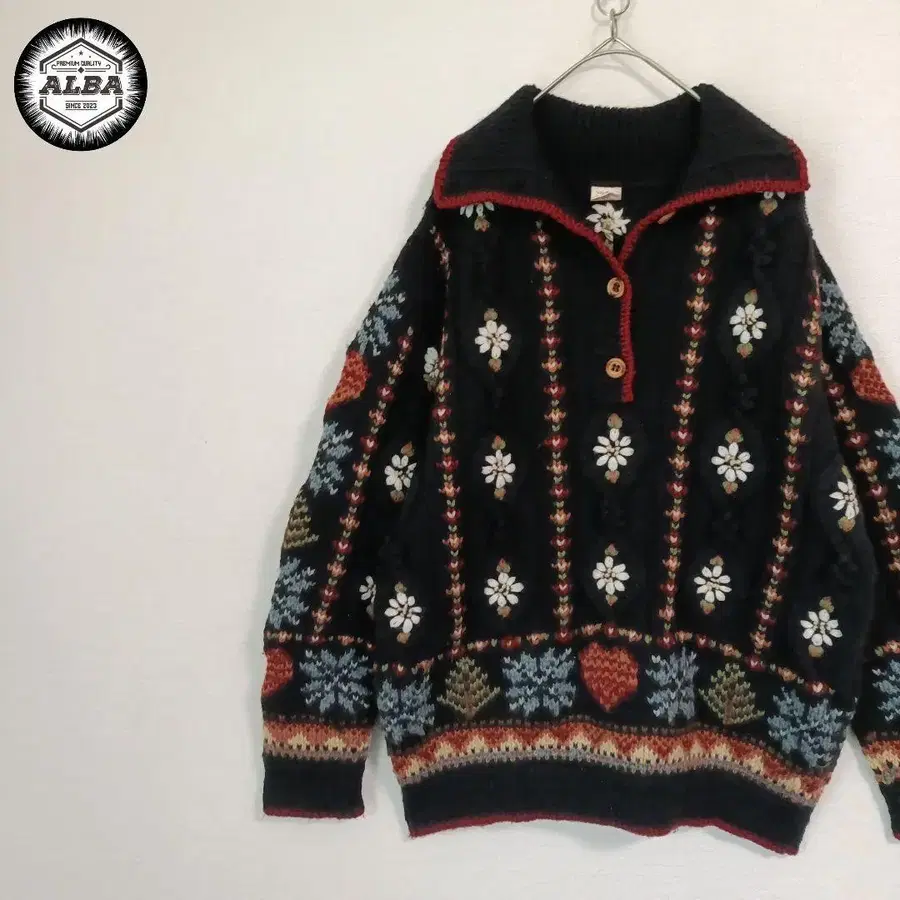 [ 새상품급 ] 스웨터 꽃무늬 자수 하프 버튼 울 에스닉 블랙