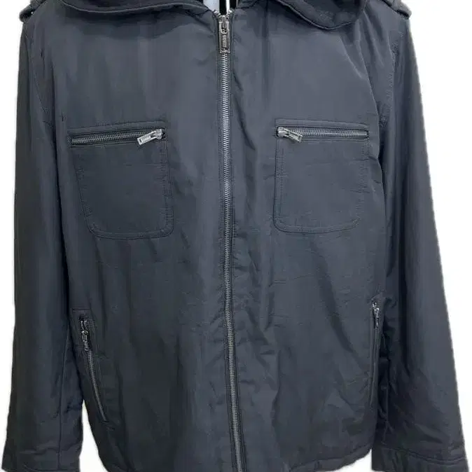 자동 번역되었어요. 원문보기후드 부착 블랙 자켓, 밀리터리 스타일이며 지퍼 포켓 부착.