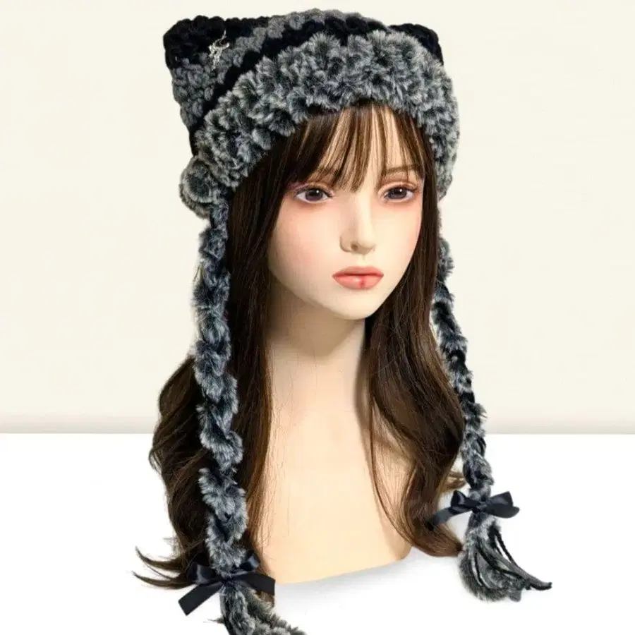 참 포함 핸드메이드 고양이 귀 니트 모자 y2k 그런지 블랙