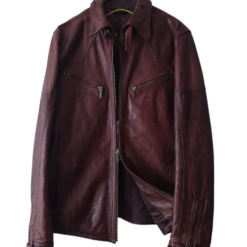 자동 번역되었어요. 원문보기스탠드 카라와 지퍼 포켓이 특징인 브라운 레더 자켓.