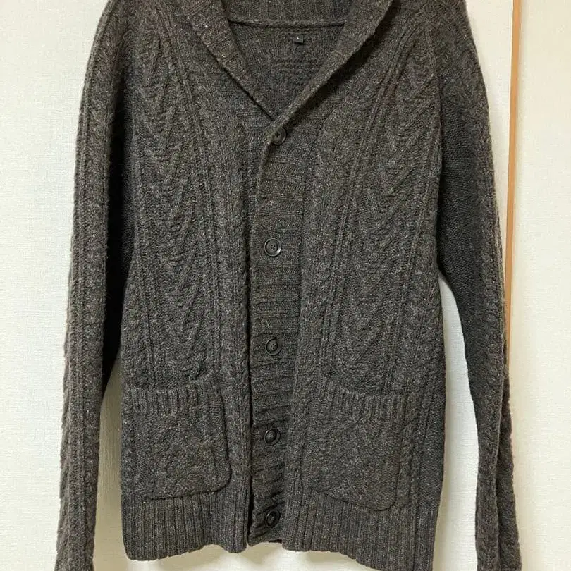 자동 번역되었어요. 원문보기다크 브라운 케이블 니트 가디건, L 사이즈, 숄카라, 앞면에 포켓 부착.