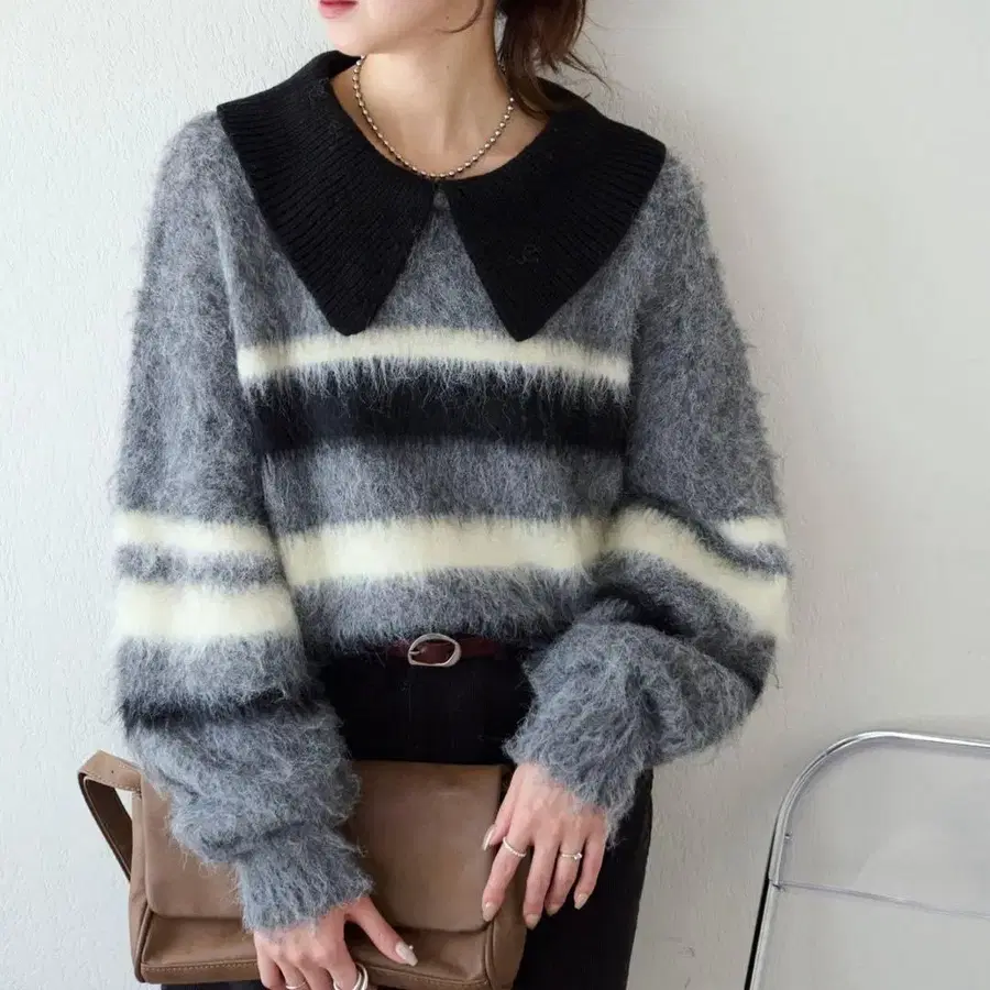 디스코트 샤기 보더 카라 부착 풀오버