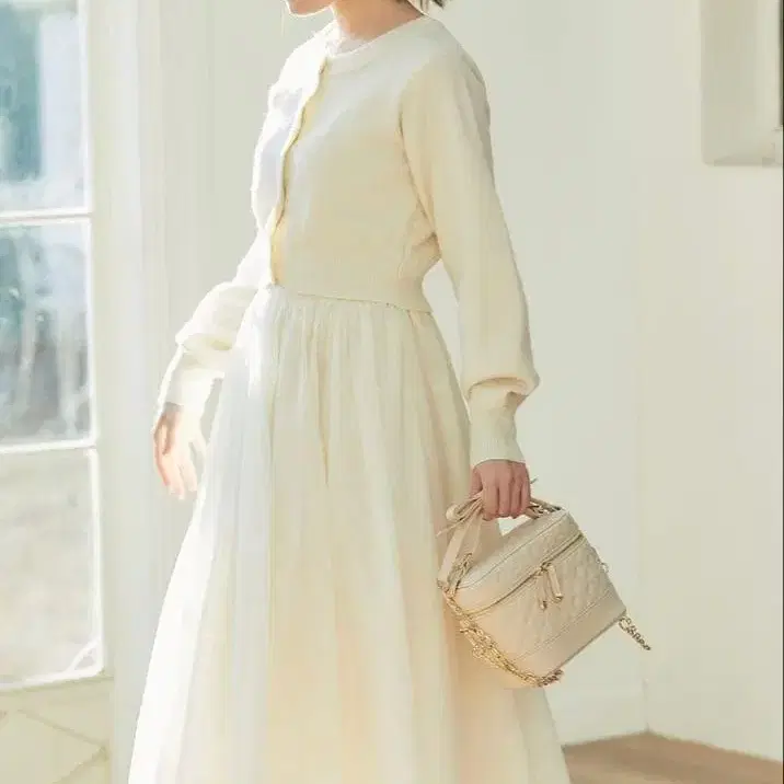 토코 클로젯 플라워 버튼 숏 기장 니트 가디건 튤 플레어 스커트