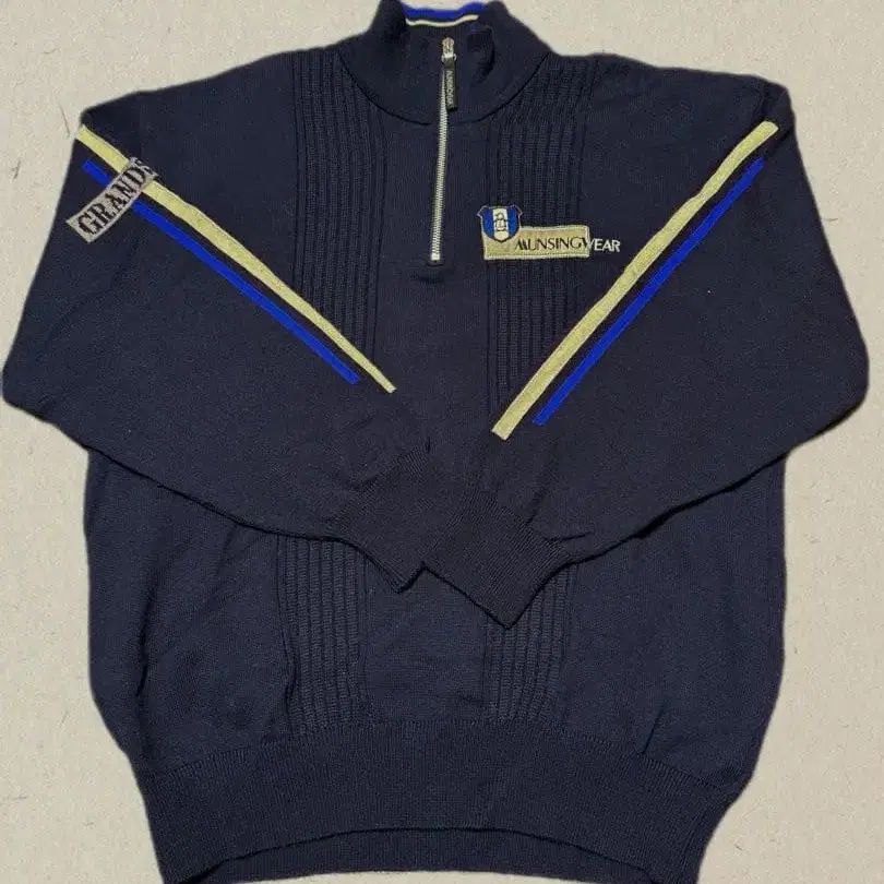 네이비 색상의 하프 지퍼 스웨터이며, 스트라이프 디자인과 Munsingwear 로고가 있습니다.