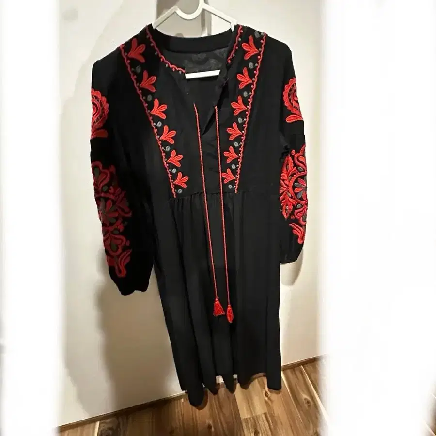 블랙 빨간색 자수 에스닉 긴팔 원피스
