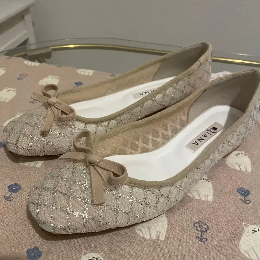 DIANA 스퀘어토 베이지 글리터 플랫 발레 슈즈 리본 포함
