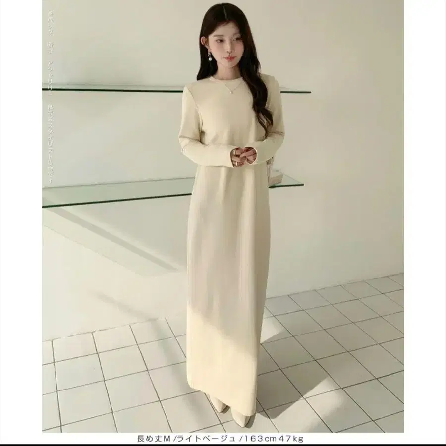 니트 원피스 롱 긴팔 아이보리 허리밴딩 슬릿 S261