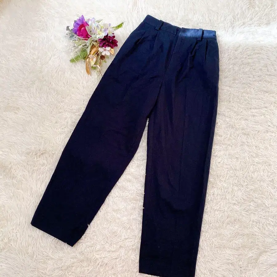 코튼 혼방 소재의 네이비 스트레이트 팬츠, 허리밴딩으로 쾌적한 착용감.